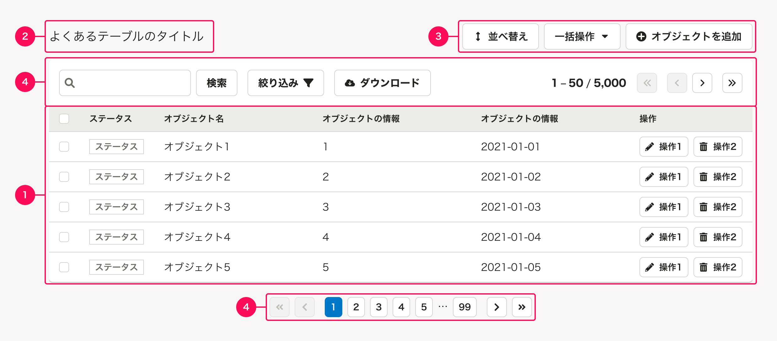 テーブルのページ数、ページ番号9,999 件中 1-5 件多くの場合、「{総件数} 件中 {表示している順番の範囲} 件」のように、現在表示しているテーブル内容の現在位置を示します。